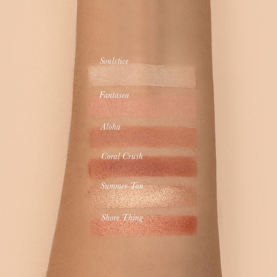 Have the softest gaze in the room with the delicate shades of TOUJOURS Peach Palette: Soulstice, Fantasea, Aloha, Summer Tan, Coral Crush, and Shore Thing.